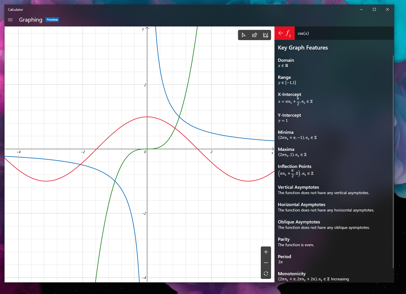 In order to get the latest graphing features, you need the latest Windows 10 2004 version or May 2020 update and update your Calculator app from the Microsoft store.