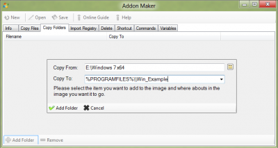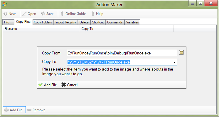 March 30, 201213 yr This tool lets you create addons for Windows 7 Toolkit, this tool has a lot of potential, more than people realize! Used correctly, this tool can have your progams pre-installed after Windows installation.This tool is the most complex, but you becomes very easy to use ones you get your head around it but this is not for the faint hearted. So good luck!Note: I will only be covering the basics!InfoThis is one of the easier screens and is pretty self explanatory and i'm pretty sure you can figure this out.FilesThis will copy file to the mounted wim image when someone adds this addon. So go ahead and click 'Add Files' at the bottom.1. Click the folder button and browse to the file you wish to copy.2. Select the destination, you can choose to a pre-defined area and then add '\\filenameyouwant.exe'You can also type it in manually like 'C:\Windows\System32\RunOnce.exe' but you would not type the beginning 'C:\' so it would be 'Windows\System32\RunOnce.exe'FolderSame as above, select the folder you wish to have installed and then select where you want the folder to go.Add any *.reg files you wish to have installed or required for your addons, some users use a program like InstallWatch which tells you what registry/file changes where made to your computer during an installation. You then export the registry changes and import them here.Delete FilesType in the location of the file you need deleting for example 'Windows\System32\Example.exe'ShortcutsThis is where you can create shortcuts for the program you made. You can just copy and paste a pre-existing shortcut from an installation in the 'File' tab and tell it where it needs to go i.e. Desktop.You don't need to use 'Icon' if the exe you pointed too already has one. Also 'Arguments' is mostly left blank as you don't need anything like /s /q /quiet, etc..CommandsThis is for commands which you want to run after Windows has been installed.It doesn't seem like it has alot of potential but trust me it does! Used correctly, you can do anything with this tool.As mentioned above you can use InstallWatch to record what an installation does, so that you can use that information to make an addon which then has that program pre-installed when you have Windows installed.Any questions about this tool (not bugs) just post in here and i will try to reply. Edited March 30, 201213 yr by Legolash2o
