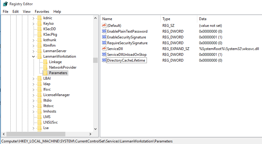 HKEY_LOCAL_MACHINE\System\CurrentControlSet\Services\Lanmanworkstation\Parameters