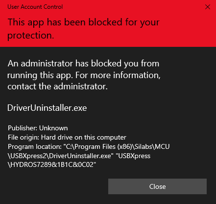 This app has been blocked for your protection. An administrator has blocked you from running this app. For more information, contact the administrator. DriverUninstaller.exe